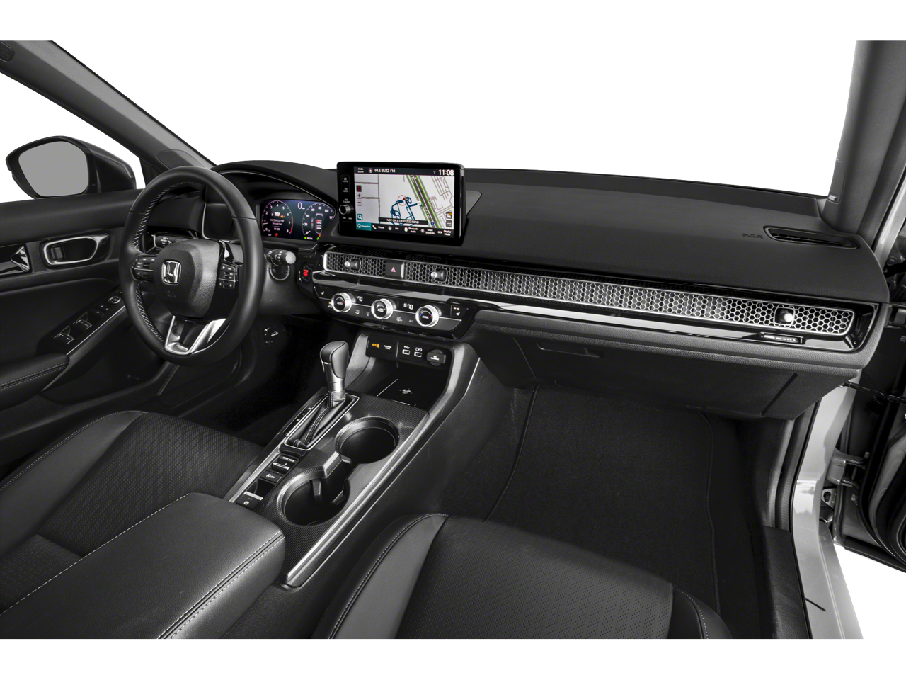 Enhancing your comfort and convenience, this Civic Sport Touring features dual-zone automatic climate control, a power driver's seat, and a leather-wrapped steering wheel. The panoramic moonroof adds an airy, open-air ambiance, while the heated front seats provide a cozy retreat on chilly days.